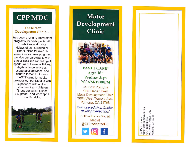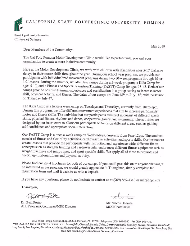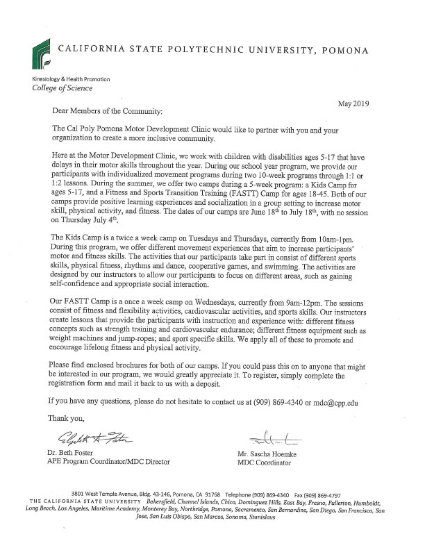 The Cal Poly Pomona Motor Development Clinic would like to partner with you and your organization to create a more inclusive community.